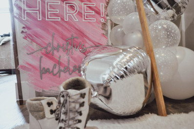 We engulfed the cabin in balloon garlands, ceiling tassels, winter florals, and a cozy backdrop complete with a custom neon sign that could be seen all the way down the road!